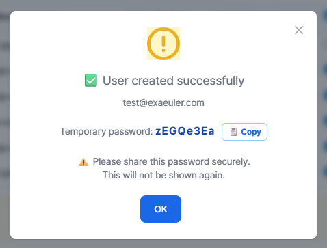 ⚠️ The temporary password is only visible at this point. Use the 📋 Copy button to copy it and securely deliver it to the user. The user can change their password in their profile after the first login.