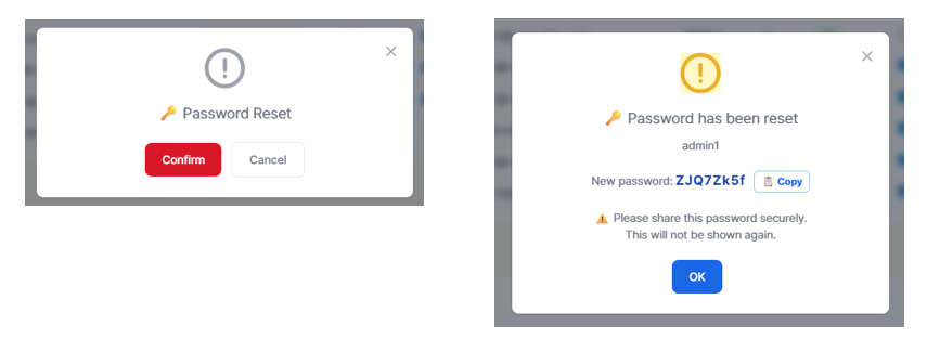 If a user has lost their password, they can click "Forgot Password?" on the login screen to reset it via email verification. Alternatively, an administrator can reset the password, generating a random temporary password. After confirmation, the new temporary password is displayed. The administrator should securely deliver the password to the user, who should change it in their profile after their first login.